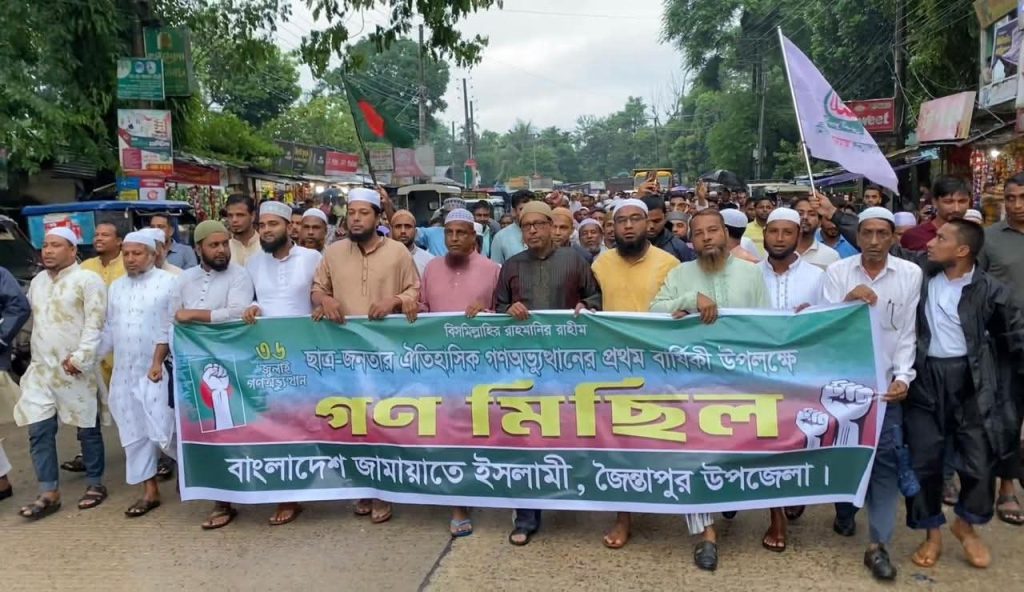 জৈন্তাপুরে ৩৬ জুলাই ঐতিহাসিক ছাত্র-জনতার গণঅভ্যুত্থানের বর্ষপূর্তি উপলক্ষে গণমিছিল ও পথসভা আয়োজন করেছে বাংলাদেশ জামায়াতে ইসলামীর জৈন্তাপুর উপজেলা শাখা।