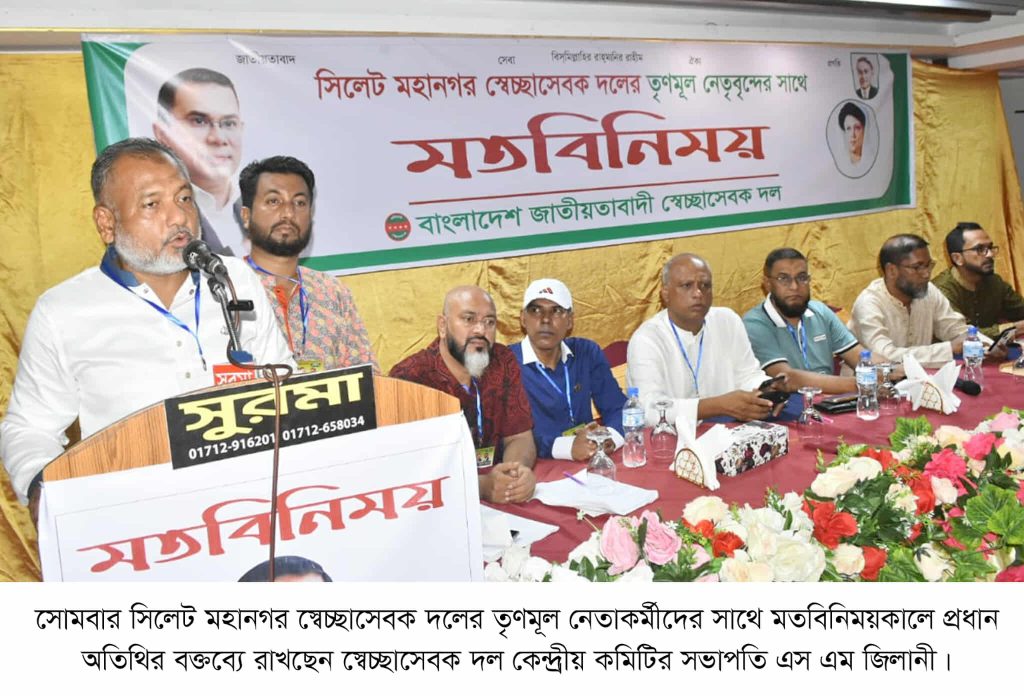 জাতীয়তাবাদী স্বেচ্ছাসেবক দল কেন্দ্রীয় কমিটির সভাপতি এস এম জিলানী সিলেট স্বেচ্ছাসেবক দলের নেতাকর্মীদের আগামী ফেব্রুয়ারীতে জাতীয় নির্বাচনের প্রস্তুতি নেওয়ার আহবান জানিয়েছেন। সোমবার (৪ আগস্ট) সিলেট মহানগর স্বেচ্ছাসেবক দলের তৃণমূল নেতাকর্মীদের সাথে নগরীর বারুতখানাস্থ একটি হোটেলের হল রুমে মতবিনিময়কালে প্রধান অতিথির বক্তব্যে এ কথাগুলো বলেন।