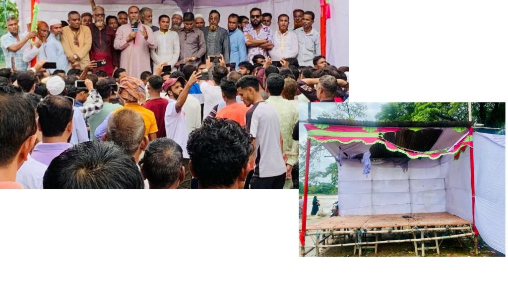 জানা গেছে, ফ্যাসিস্ট হাসিনা বিদায় ও ছাত্র জনতার গণঅভ্যুত্থানের বর্ষপূর্তি উপলক্ষ্যে উপজেলা বিএনপি ও সহযোগী সংঠনের নেতৃবৃন্দের আয়োজনে মঞ্চ নির্মাণ করা হয়েছে। আনুমানিক ভোর ৪ দিকে মঞ্চে অগ্নিসংযোগ করেছে দুষ্কৃতিকারীরা। এদিকে মঞ্চে আগুনের খবর পেয়ে ঘটনাস্থল পরিদর্শন করেছেন জেলা ও উপজেলা বিএনপির নেতৃবৃন্দ, জামায়েত ইসলামের নেতৃবৃন্দ, খেলাফত মজলিসের নেতৃবৃন্দ, উপজেলা মাঠ প্রশাসন, পুলিশ প্রশাসন প্রমুখ। কিন্তু প্রশ্ন উঠেছে থানার ২০০ মিটারের মধ্যে বিএনপির মঞ্চ, আগুন দিল কে ?