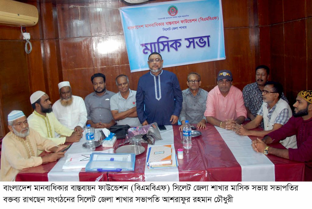 বাংলাদেশ মানবাধিকার বাস্তবায়ন ফাউন্ডেশন (বিএমবিএফ) সিলেট জেলা শাখার মাসিক সভা অনুষ্ঠিত হয়েছে। বুধবার (৬ আগস্ট) বিকেলে নগরীর তালতলাস্থ একটি হোটেলের সম্মেলনকক্ষে অনুষ্ঠিত এ সভায় সভাপতিত্ব করেন বাংলাদেশ মানবাধিকার বাস্তবায়ন ফাউন্ডেশন (বিএমবিএফ) সিলেট জেলা শাখার সভাপতি আশরাফুর রহমান চৌধুরী। সভাপতির বক্তব্যে আশরাফুর রহমান চৌধুরী বলেন, মানবাধিকার মানুষের জন্মগত অধিকার। এর অধিকার কেউ কখনো কারো কাছ থেকে কেড়ে নিতে পারে না। জীবনের প্রতিটি ক্ষেত্রে মৌলিক মানবাধিকার নিশ্চিত করতে হবে। এজন্য রাষ্ট্রের পাশাপাশি সমাজের প্রতিটি শ্রেণি-পেশার মানুষকে কাজ করতে হবে। তিনি বলেন, মানবাধিকার সমুন্নত রাখতে বাংলাদেশ মানবাধিকার বাস্তবায়ন ফাউন্ডেশন নিরলসভাবে কাজ করে যাচ্ছে। যেখানেই মানবাধিকার লঙ্ঘিত হচ্ছে, বিএমবিএফ সেখানেই সোচ্চার থেকেছে। মানবাধিকারের প্রশ্নে আমরা কখনোই আপোষ করবো না।