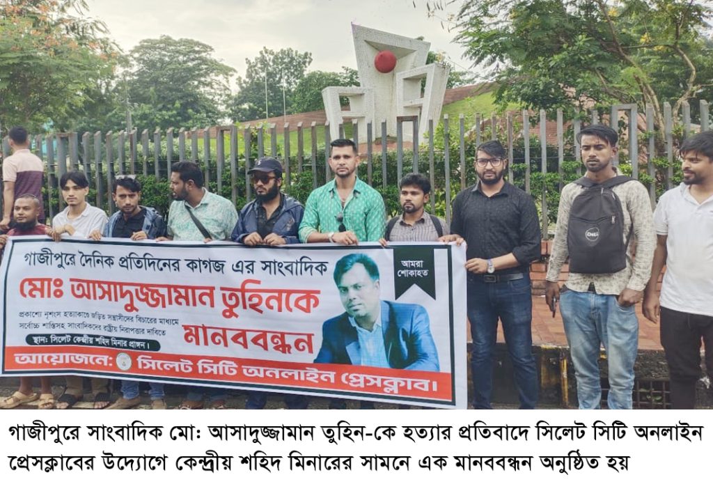 সিলেট সিটি অনলাইন প্রেসক্লাবের উদ্যোগে গাজীপুরে সাংবাদিক মো: আসাদুজ্জামান তুহিন-কে হত্যার প্রতিবাদে শনিবার (৯ আগস্ট) বিকাল ৪টায় নগরীর চৌহাট্টাস্থ কেন্দ্রীয় শহিদ মিনারের সামনে এক মানববন্ধন অনুষ্ঠিত হয়।