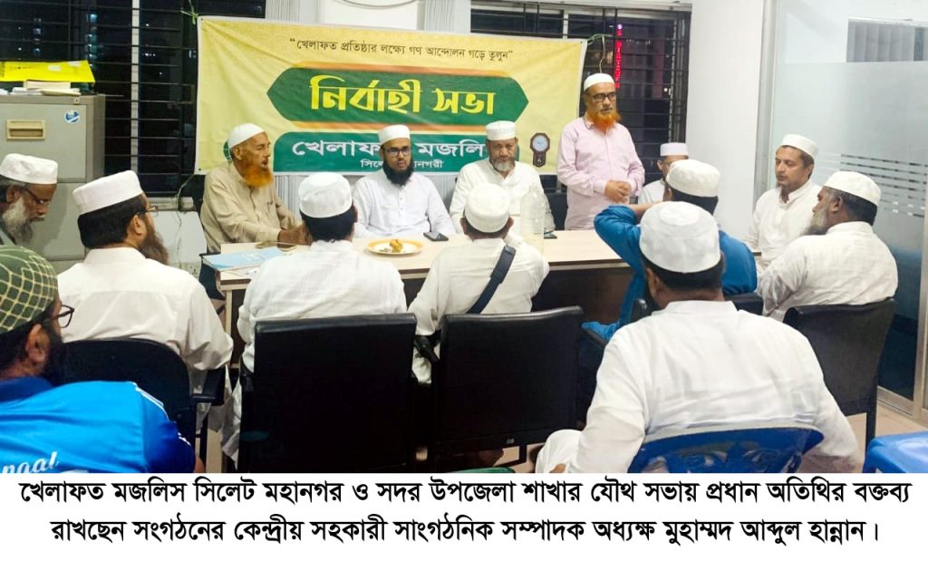 আসন্ন জাতীয় সংসদ নির্বাচনে সিলেট-১ আসনে খেলাফত মজলিস মমনোনীত প্রার্থী মাওলানা তাজুল ইসলাম হাসানের সমর্থনে নির্বাচনী প্রস্তুতি গ্রহণের লক্ষ্যে সংগঠনের সিলেট মহানগর ও সদর উপজেলা শাখার এক যৌথ নির্বাহী সভা আজ ৯ আগস্ট শনিবার রাত সাড়ে ৭টায় অনুষ্ঠিত হয়। সিলেট মহানগর সভাপতি হাফিজ মাওলানা তাজুল ইসলাম হাসানের সভাপতিত্বে ও সাধারণ সম্পাদক হাফিজ জাবেদুল ইসলাম চৌধুরীর পরিচালনায় অনুষ্ঠিত সভায় প্রধান অতিথির বক্তব্য রাখেন সংগঠনের কেন্দ্রীয় সহকারী সাংগঠনিক সম্পাদক অধ্যক্ষ মুহাম্মদ আব্দুল হান্নান। বিশেষ অথিতির বক্তব্য রাখেন কেন্দ্রীয় নির্বাহী পরিষদ সদস্য ও সিলেট জেলা সভাপতি মাওলানা নেহাল আহমদ।