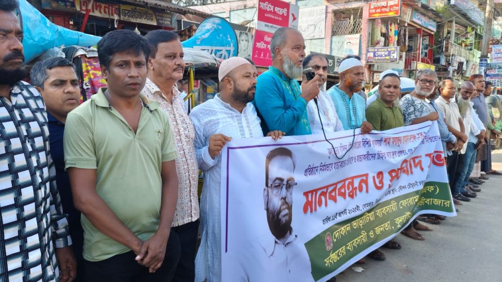 (১১ আগস্ট) সোমবার বিকেলে স্টেশন চৌমুহনী চত্ত্বরে দোকান ভাড়াটিয়া ব্যবসায়ী ফোরাম (টিবিএফ), সর্বস্তরের ব্যবসায়ী ও জনতার আয়োজনে এ মানববন্ধন ও প্রতিবাদ সভা অনুষ্ঠিত হয়।