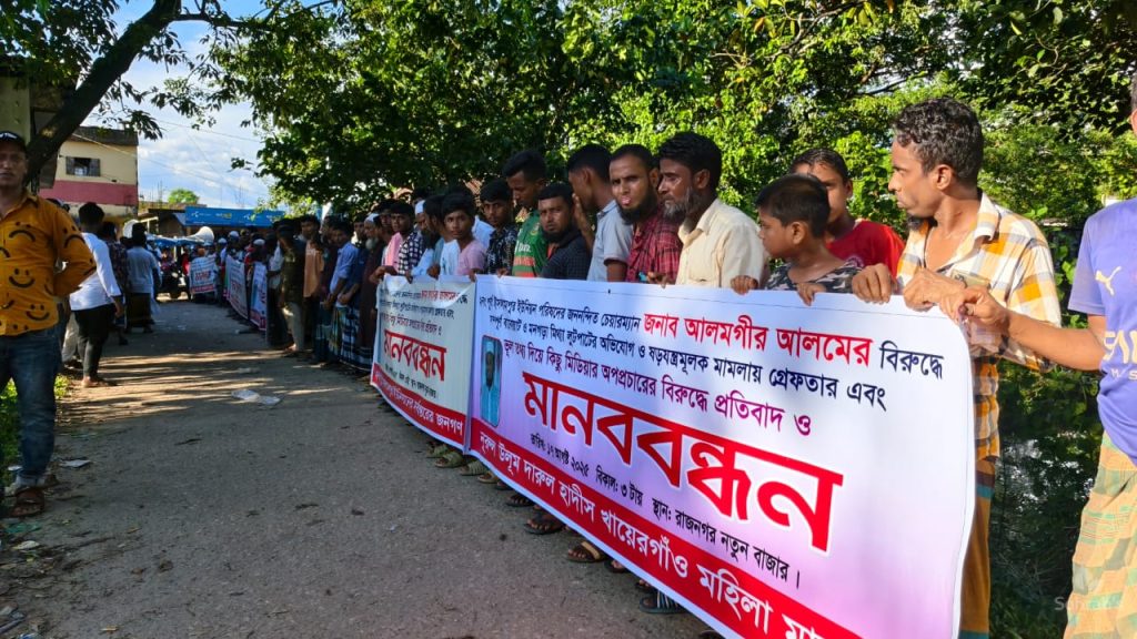 মানববন্ধনে অংশগ্রহণকারীরা অবিলম্বে চেয়ারম্যান আলমগীর আলমের মুক্তি দাবি করেন এবং সতর্ক করে বলেন, দাবি না মানা হলে কঠোর কর্মসূচি ঘোষণা করা হবে।