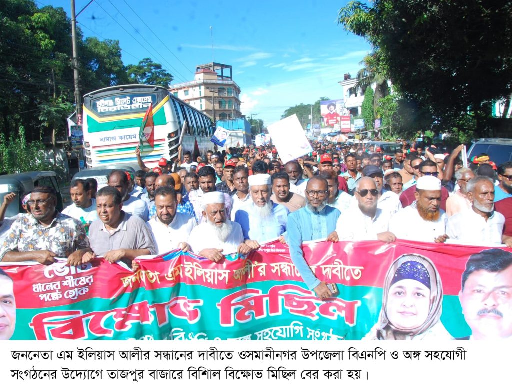 সিলেট-২ আসনের সাবেক সংসদ সদস্য ও বিএনপির সাবেক সাংগঠনিক সম্পাদক নিখোঁজ বিএনপি নেতা এম ইলিয়াস আলীর সন্ধান মিলছে না এক যুগেরও বেশি সময় ধরে। তাকে ফিরে পাওয়ার দাবিতে আবারও রাজপথে নেমেছে ওসমানীনগর উপজেলা বিএনপি ও অঙ্গ সহযোগী সংগঠনের নেতাকর্মীরা। জননেতা এম ইলিয়াস আলীর সন্ধানের দাবীতে ওসমানীনগর উপজেলা বিএনপি ও অঙ্গ সহযোগী সংগঠনের উদ্যোগে রোববার (১৭ আগস্ট) বেলা ৪টার দিকে ওসমানীনগরের তাজপুর বাজারে বিক্ষোভ মিছিল ও পথসভা অনুষ্ঠিত হয়েছে। এতে হাজার হাজার নেতাকর্মী ইলিয়াস-লুনা স্লোগানে মুখরিত করে ওসমানীনগরের রাজপথ। মিছিলটি সিলেট-ঢাকা মহাসড়কের প্রধান প্রধান সড়ক প্রদক্ষিণ করে সমাবেশে রুপ নেয়।