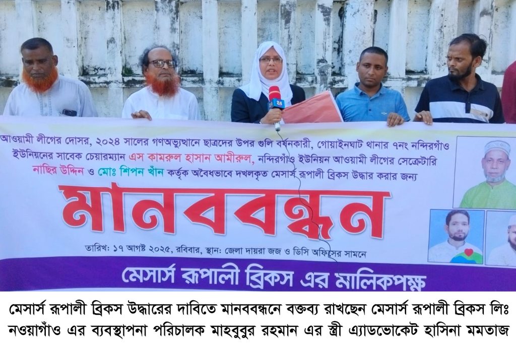 মানববন্ধনে এ্যাডভোকেট হাসিনা মমতাজ বলেন, আমার স্বামী অনেক কষ্টে টাকা সঞ্চয় করে ২০১৯ সালে সিলেট জেলার গোয়াইনঘাট থানাধীন নন্দীরগাঁও ইউনিয়নের নওয়াগাঁও গ্রামে উক্ত মেসার্স রূপালী ব্রিকস লিঃ প্রতিষ্ঠা করেন। প্রতিষ্ঠার পর থেকে নন্দীরগাঁও ইউনিয়ন এর আওয়ামী লীগ চেয়ারম্যান এস. কামরুল আমিরুল হাসাল এর শকুন দৃষ্টি উক্ত ব্রিকস ফিল্ড এ পরে। এই আওয়ামী লীগ চেয়ারম্যান অতি চতুরতার সহিত ২০২৩ ইং সালে আমার স্বামীর মেসার্স রূপালী ব্রিকস লিঃ এর নাম পরিবর্তন করে নওয়াগাঁও ব্রিকস লিঃ নামে একটি পরিবেশ ছাড়পত্র গ্রহণ করে। আমি বিষয়টি জানতে পেরে পরিবেশ অধিদপ্তরে একটি দরখাস্ত করলে দীর্ঘ শুনানীর পর উক্ত ছাড়পত্রটি বাতিল হয়।