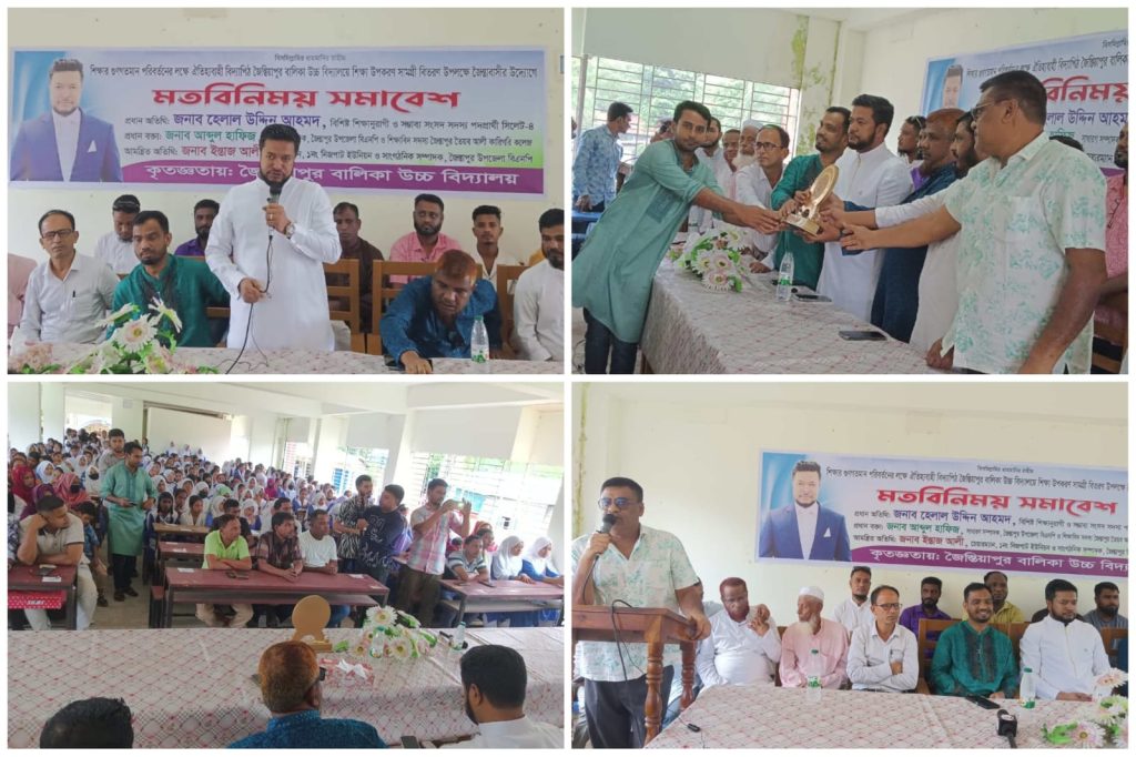 বৃহস্পতিবার (২১ আগস্ট) বেলা ১২ টায় জৈন্তাবাসীর উদ্যোগে আয়োজিত অনুষ্ঠানে উপজেলা যুবদলের যুগ্ম আহ্বায়ক সাব্বির আহমদের সঞ্চালনায় জৈন্তিয়াপুর বালিকা উচ্চ বিদ্যালয় এডহক কমিটির সভাপতি মাসুক আহমদ সভাপতিত্বে সভায় প্রধান অতিথি হিসেবে উপস্থিত ছিলেন বিশিষ্ট শিক্ষানুরাগী ও সিলেট-৪ আসনের সম্ভাব্য সংসদ সদস্য পদপ্রার্থী হেলাল উদ্দিন আহমদ।