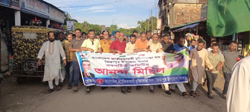 বাংলাদেশ জাতীয়তাবাদী মুক্তিযোদ্ধা দল জৈন্তাপুর উপজেলা শাখার নবগঠিত কমিটি উদযাপন করেছে এক আনন্দ মিছিলের মাধ্যমে, যা দলীয় ঐক্য ও সাংগঠনিক শক্তি প্রদর্শনের এক উজ্জ্বল উদাহরণ হিসেবে দাঁড়িয়েছে। বুধবার (২৭ আগস্ট) বিকেল ৫টায় নিজপাট ইউনিয়ন অফিস প্রাঙ্গণ থেকে মিছিলটি শুরু হয়ে উপজেলা সদরের গুরুত্বপূর্ণ সড়ক প্রদক্ষিণ শেষে স্মৃতিস্থম্ভ সংলগ্ন পথসভায় সমাপ্ত হয়।