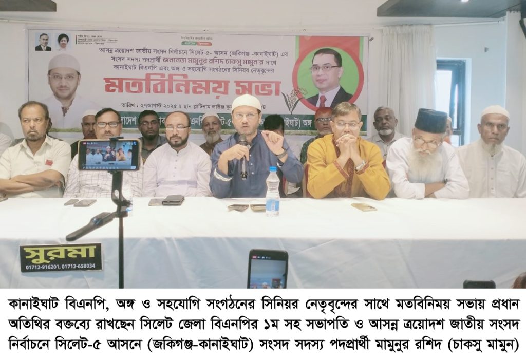 বুধবার (২৭ আগস্ট) দুপুরে সিলেট নগরীর কুমারপাড়াস্থ একটি অভিজাত রেস্টুরেন্টের হলরুমে কানাইঘাট বিএনপি, অঙ্গ ও সহযোগি সংগঠনের সিনিয়র নেতৃবৃন্দের সাথে মতবিনিময় সভায় প্রধান অতিথির বক্তব্যে তিনি এসব কথা বলেন।