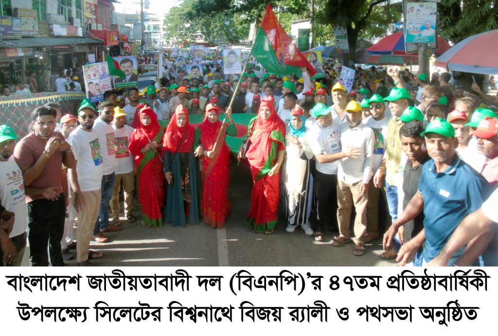 বাংলাদেশ জাতীয়তাবাদী দল (বিএনপি)’র ৪৭তম প্রতিষ্ঠাবার্ষিকী উপলক্ষ্যে সিলেটের বিশ্বনাথে বিজয় র্যালী ও পথসভা অনুষ্ঠিত হয়েছে। বুধবার (৩ সেপ্টেম্বর) বিকেলে ‘বিশ্বনাথ উপজেলা ও পৌর’ বিএনপি ও অঙ্গ-সহযোগী সংগঠনের উদ্যোগে বিজয় র্যালী ও পথসভা অনুষ্ঠিত হয়।