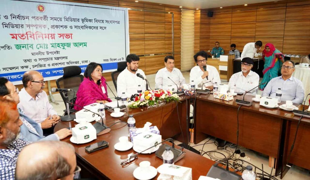 তথ্য ও সম্প্রচার উপদেষ্টা মোঃ মাহফুজ আলম বলেছেন, নির্বাচন-পূর্ব, নির্বাচনকালীন ও নির্বাচন-পরবর্তী সময়ে সাংবাদিকদের সতর্ক, সচেতন ও দায়িত্বশীল ভূমিকা পালন করতে হবে। এটি করতে পারলে গণমাধ্যমের প্রতি মানুষের যে অনাস্থা সৃষ্টি হয়েছে, সেটি কেটে যাবে। রবিবার (৭ই সেপ্টেম্বর) ঢাকার তথ্য ভবনে ডিএফপির সভাকক্ষে নির্বাচনের সময় গণমাধ্যমের ভূমিকা বিষয়ক মতবিনিময় সভায় সভাপতির বক্তব্যে উপদেষ্টা এসব কথা বলেন।