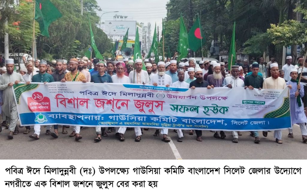 পবিত্র ঈদে মিলাদুন্নবী (দঃ) উপলক্ষ্যে ১২ই রবিউল আউয়াল শনিবার (৬ সেপ্টেম্বর) গাউসিয়া কমিটি বাংলাদেশ সিলেট জেলার উদ্যোগে সকাল ১০টায় হযরত শাহজালাল (র.) এর দরগাহ প্রাঙ্গণ থেকে বিশাল জশনে জুলুস বের করা হয়।