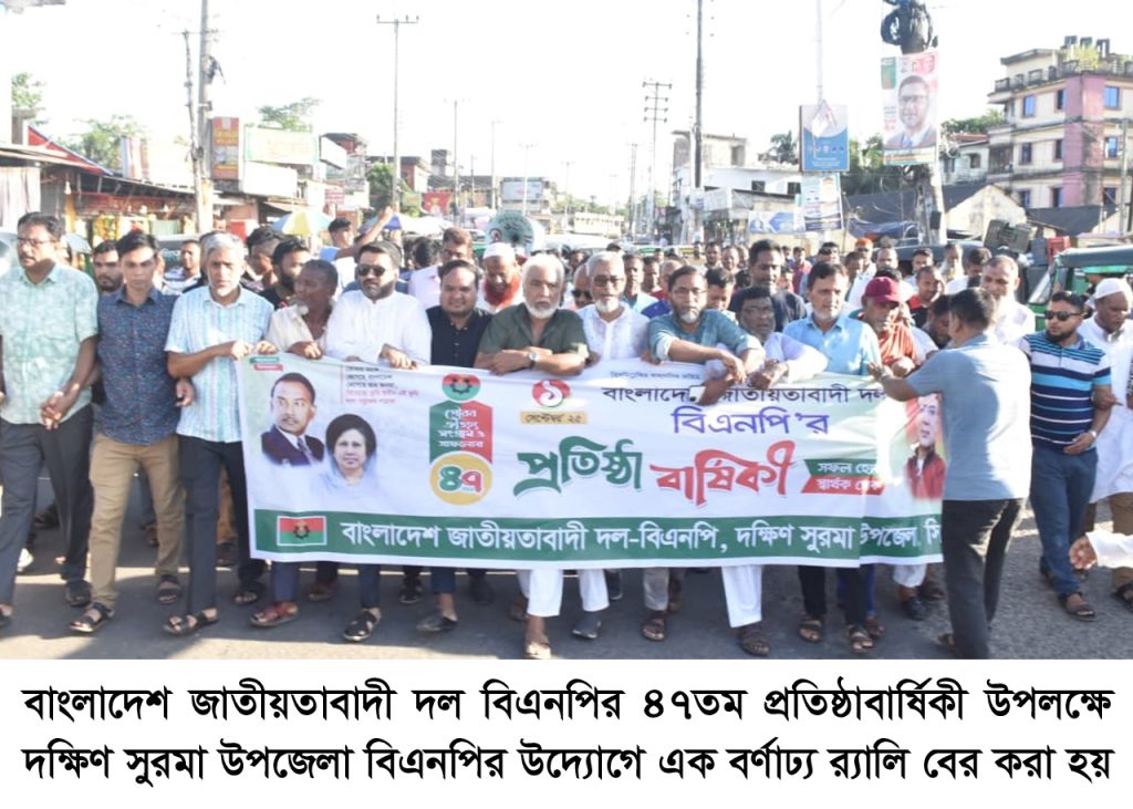 বাংলাদেশ জাতীয়তাবাদী দল বিএনপির ৪৭তম প্রতিষ্ঠাবার্ষিকী উপলক্ষে দক্ষিণ সুরমা উপজেলা বিএনপির উদ্যোগে বুধবার (৩ সেপ্টেম্বর) বিকেলে এক বর্ণাঢ্য র্যালি বের করা হয়। র্যালিটি বিভিন্ন সড়ক প্রদক্ষিণ করে খোজারখলা স্কয়ারে গিয়ে সমাবেশে মিলিত হয়।