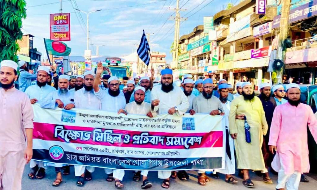 আজ রবিবার (৭ সেপ্টেম্বর) বাদ আসর গোলাপগঞ্জ চৌমুহনী থেকে বিক্ষোভ মিছিল শুরু হয়ে বাজারের প্রধান সড়ক প্রদক্ষিণ করে জমিয়ত কার্যালয়ের সামনে গিয়ে শেষ হয়।