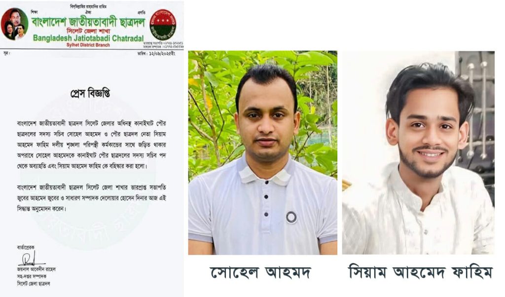 শুক্রবার (১২ সেপ্টেম্বর) সিলেট জেলা জাতীয়বাদী ছাত্রদলের সহ দপ্তর সম্পাদক জয়নাল আবেদীন রাহেল স্বাক্ষরিত এক প্রেস বিজ্ঞপ্তিতে পৌর ছাত্রদলের সদস্য সচিব সোহেল আহমদকে অব্যাহতি ও পৌর ছাত্রদল নেতা সিয়াম আহমেদ ফাহিমকে বহিষ্কার করা হয়। সিলেট জেলা ছাত্রদলের ভারপ্রাপ্ত সভাপতি জুবের আহমেদ জুবের ও সাধারণ সম্পাদক দেলোয়ার হোসেন দিনার এই সিদ্ধান্ত অনুমোদন করেন।
