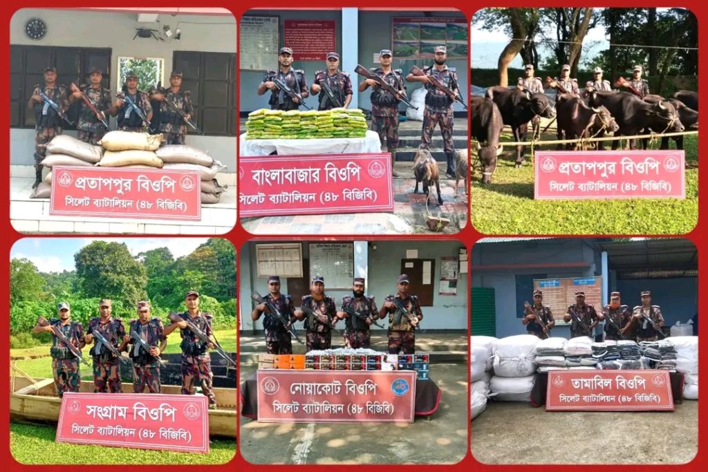 রোববার ২৮ সেপ্টেম্বর সিলেট ব্যাটালিয়ন (৪৮ বিজিবি) এর আওতাধীন সীমান্তবর্তী নোয়াকোট, সংগ্রাম, তামাবিল, বিছনাকান্দি, কালাইরাগ, বাংলাবাজার, প্রতাপপুর, সোনালীচেলা ও উৎমা বিওপি এলাকায় এসব অভিযান পরিচালনা করা হয়।