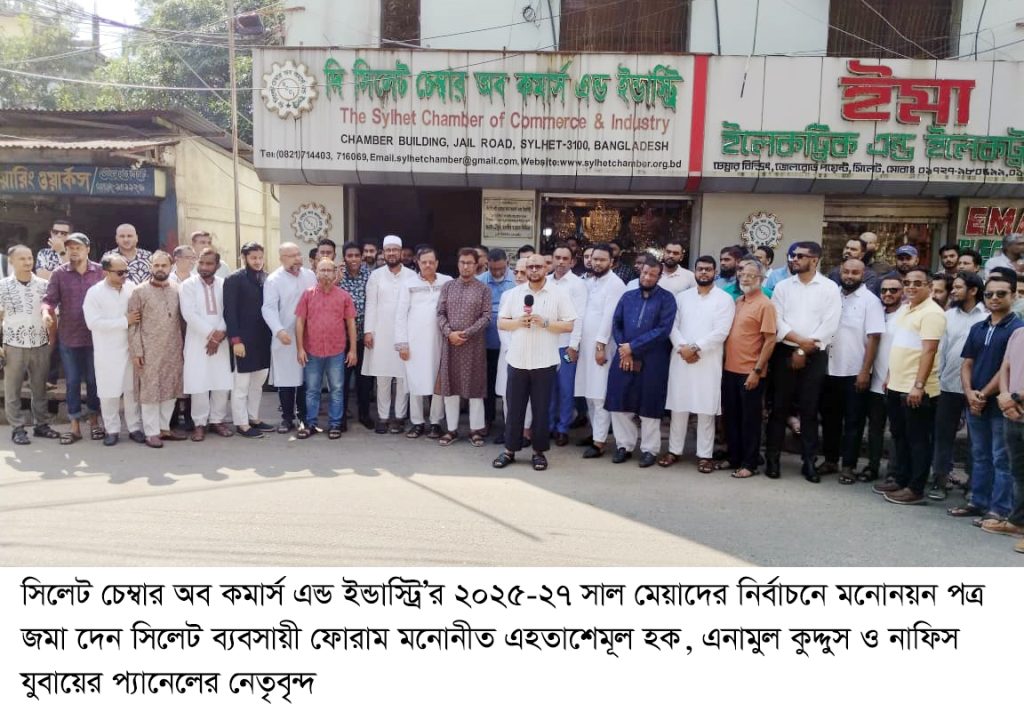 আগামী ১ লা নভেম্বর শনিবার অনুষ্টিতব্য দি সিলেট চেম্বার অব কমার্স এন্ড ইন্ডাস্ট্রি’র ২০২৫-২৭ সাল মেয়াদের নির্বাচনে মনোনয়নপত্র জমা দিয়েছেন সিলেট ব্যবসায়ী ফোরাম মনোনীত এহতাশেমূল হক, এনামুল কুদ্দুস ও নাফিস যুবায়ের প্যানেলের নেতৃবৃন্দ।