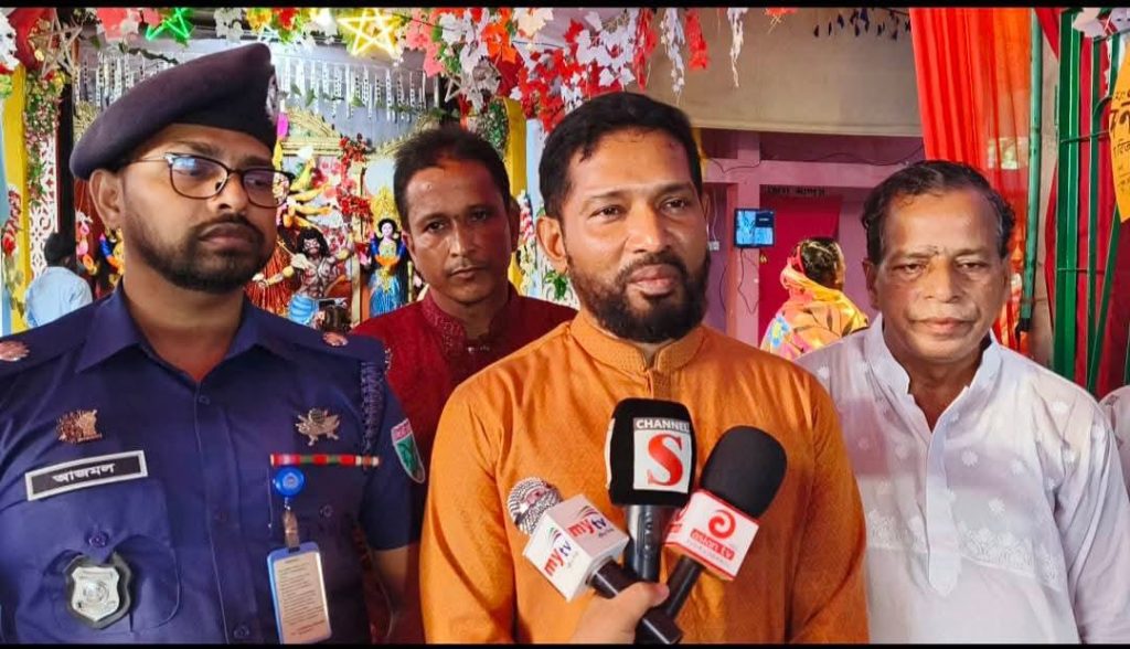 এসময় পুলিশ সুপার এম.কে.এইচ জাহাঙ্গীর হোসেন বলেন, শারদীয় দুর্গোৎসব তথা যেকোনো ধর্মীয় অনুষ্ঠানে আমাদের সকলের মাঝে সুন্দর ও সৌহার্দ্যপূর্ণ পরিবেশ অক্ষুন্ন আছে। আমাদের মাঝে যে সৌহার্দ্যপূর্ণ পরিবেশ বিদ্যমান রয়েছে তার উজ্জ্বল দৃষ্টান্ত হচ্ছে একই আঙিনায় মসজিদ ও মন্দির। এখানে নামাজের সময় মুসলমানের নামাজ পড়ছে ও নামাজের পর হিন্দু ধর্মের সকলে তাদের পূজা-অর্চনা করছে। নির্ভয়ে যাতে সকলে শারদীয় দুর্গোৎসব উদযাপন করতে পারে সে লক্ষ্যে পুলিশ কাজ করে যাচ্ছে।