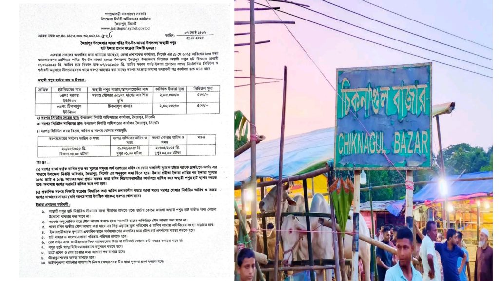 জৈন্তাপুর উপজেলার দরবস্ত ও চিকনাগুল বাজারে ঈদুল আজহা উপলক্ষে মাত্র সাত দিনের জন্য অনুমোদন পাওয়া দুটি অস্থায়ী পশুর হাট পাঁচ মাস পেরিয়েও চলছে অবাধে। বিষয়টি নিয়ে সরকারি ভাবে লিজভুক্ত উপজেলার পশুর হাটের ইজারাদার ও স্থানীয়দের অভিযোগে উঠে এসেছে, নির্ধারিত সময়সীমা অতিক্রম করলেও প্রভাবশালী একটি মহল প্রশাসনের সাথে যোগসাজশে হাটগুলো পরিচালনা করছে। এতে সরকার বিপুল পরিমাণ রাজস্ব হারাচ্ছে এবং বৈধ পশুর হাটের ব্যবসায়ীরা ক্ষতির সম্মুখীন হচ্ছেন।
