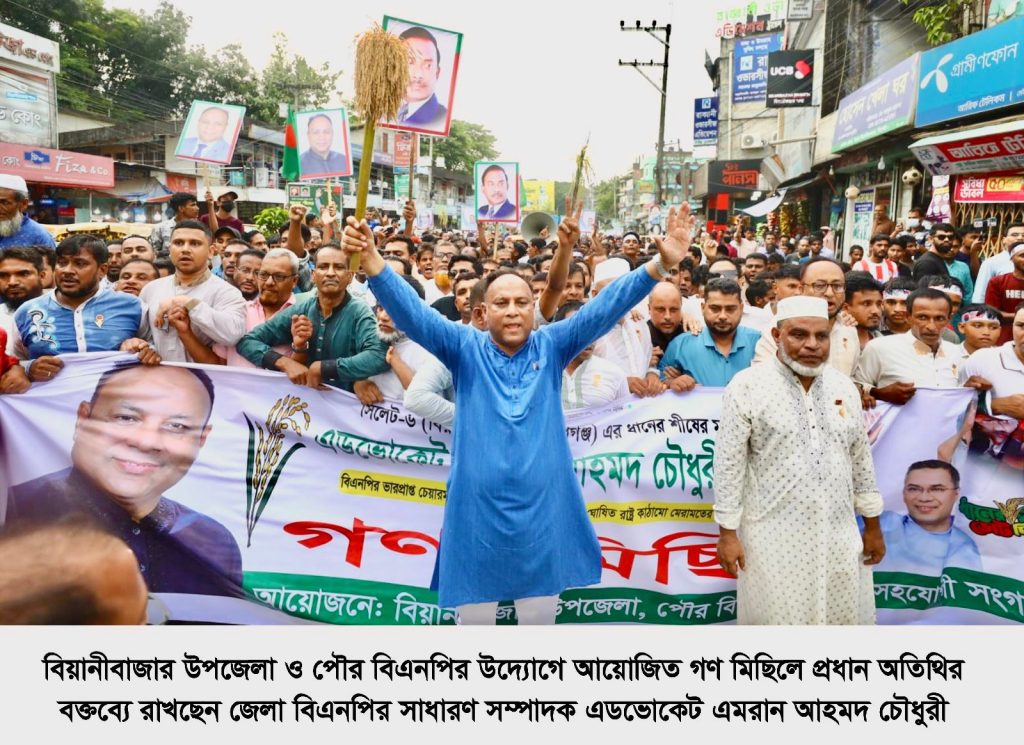 সিলেটের বিয়ানীবাজারে দীর্ঘ ১৭ বছর পর বিশাল লোকসমাগম প্রত্যক্ষ করলো এলাকাবাসী। বিএনপি’র ভারপ্রাপ্ত চেয়ারম্যান তারেক রহমান ঘোষিত রাষ্ট্রকাঠামো মেরামতের ৩১ দফার পক্ষে জনমত গঠনের লক্ষ্যে বিয়ানীবাজার উপজেলা ও পৌর বিএনপি’র যৌথ উদ্যোগে আয়োজিত গণমিছিলে হাজার হাজার দলীয় নেতাকর্মীর মুহুর্মূহু শ্লোগানে মুখরিত হয়ে ওঠে বিয়ানীবাজারের রাজপথ। দলীয় নেতাকর্মী ও সাধারণ মানুষের স্বত:স্ফুর্ত উপস্থিতি বিয়ানীবাজারে বিএনপির রাজনীতিতে এক নতুন মাত্রা যোগ করলো গতকাল বৃহস্পতিবার।