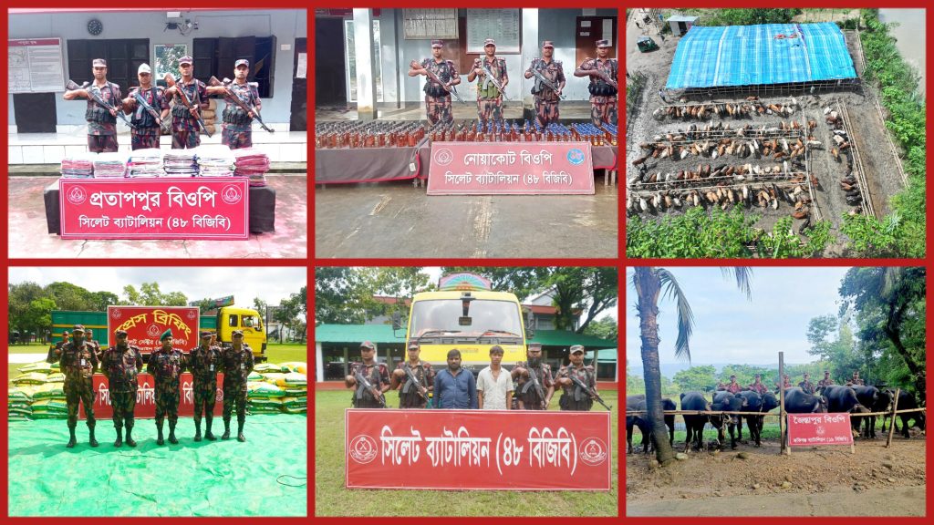 বিজিবি পাঠানো বিজ্ঞপ্তিতে জানায়, ৪৮ বিজিবির অধীনস্থ নোয়াকোট, শ্রীপুর, প্রতাপপুর, দমদমিয়া ও সোনালীচেলা বিওপি কর্তৃক গোপন সংবাদের ভিত্তিতে একাধিক অভিযান পরিচালনা করে বিপুল পরিমাণ ভারতীয় মদ, শাড়ি, গরু, চিনি এবং অবৈধভাবে বালু উত্তোলনকারী নৌকা আটক করা হয়। একই দিনে ব্যাটালিয়ন সদরের একটি বিশেষ টহলদল সেনাবাহিনীর সহায়তায় গোয়াইনঘাট উপজেলার হাদারপাড় এলাকায় অভিযান চালিয়ে বিপুল পরিমাণ ভারতীয় জিরা ও দুইজন চোরাকারবারীকে আটক করে। পরে আটককৃতদের গোয়াইনঘাট থানায় হস্তান্তর করা হয়। পরিচালিত এসব অভিযানে জব্দকৃত মালামালের আনুমানিক সিজারমূল্য প্রায় এক কোটি পঞ্চাশ লক্ষ টাকা বলে জানিয়েছে বিজিবি।