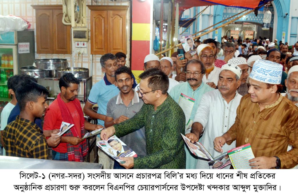 সিলেট-১ (নগর-সদর) সংসদীয় আসনে প্রচারপত্র বিলি’র মধ্য দিয়ে ধানের শীষ প্রতিকের অনুষ্ঠানিক প্রচারণা শুরু করলেন বিএনপির চেয়ারপার্সনের উপদেষ্টা খন্দকার আব্দুল মুক্তাদির।