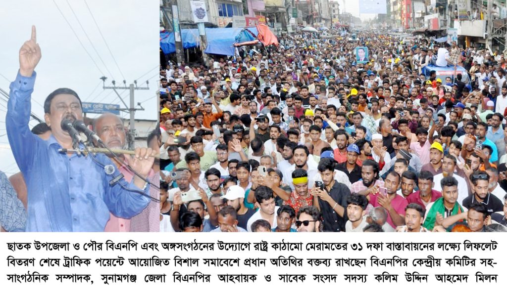 বুধবার (৮ অক্টোবর) বিকেলে ছাতকের রহমতবাগ এলাকা থেকে বিশাল শো-ডাউনের মধ্য দিয়ে ছাতক পৌর শহরে ৩১ দফার লিফলেট বিতরণ শেষে ট্রাফিক পয়েন্টে ছাতক উপজেলা ও পৌর বিএনপি এবং অঙ্গসংগঠন আয়োজিত বিশাল সমাবেশে প্রধান অতিথির বক্তব্যে তিনি উপরোক্ত কথাগুলো বলেন।