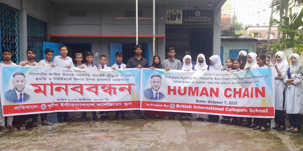 মঙ্গলবার (৭ অক্টোবর) বিকেলে স্কুল ছুটি শেষে নগরীর মজুমদারিস্থ বৃটিশ ইন্টার ন্যাশনাল কলিজিয়েট স্কুলে এ মানববন্ধন অনুষ্ঠিত হয়। প্রবাসী জাহিদ খাঁন এই স্কুলের পরিচালক।