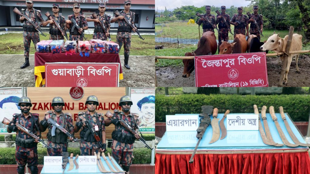 একই দিন সীমান্তবর্তী বিভিন্ন এলাকায় বিজিবির জৈন্তাপুর ও গুয়াবাড়ি বিওপির পাঁচটি পৃথক টহল দল অভিযান পরিচালনা করে। অভিযানে মালিকবিহীন অবস্থায় ৪০ পিস ভারতীয় শাড়ি, ১৩টি গরু এবং ২টি মহিষ জব্দ করা হয়। এসব চোরাচালানি পণ্যের বাজারমূল্য আনুমানিক ১৫ লাখ ৬০ হাজার টাকা।