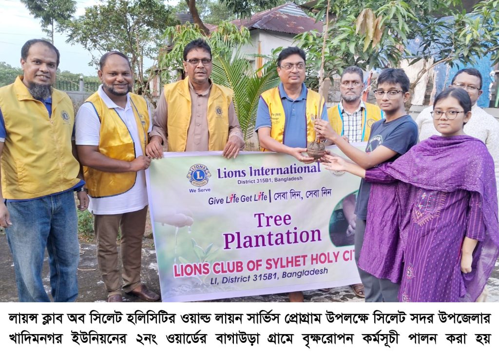 লায়ন্স ক্লাব অব সিলেট হলিসিটির ওয়াল্ড লায়ন সার্ভিস প্রোগ্রাম উপলক্ষে এক বৃক্ষরোপন কর্মসূচী পালন করা হয়েছে। শনিবার (১১ অক্টোবর) সকালে সিলেট সদর উপজেলার খাদিমনগর ইউনিয়নের ২নং ওয়ার্ডের বাগাউড়া গ্রামে এ বৃক্ষরোপন কর্মসূচী অনুষ্ঠিত হয়। এছাড়াও আশপাশের কয়েকটি বাড়িতে বৃক্ষরোপন ও বৃক্ষের চারা বিতরণ করা হয়।