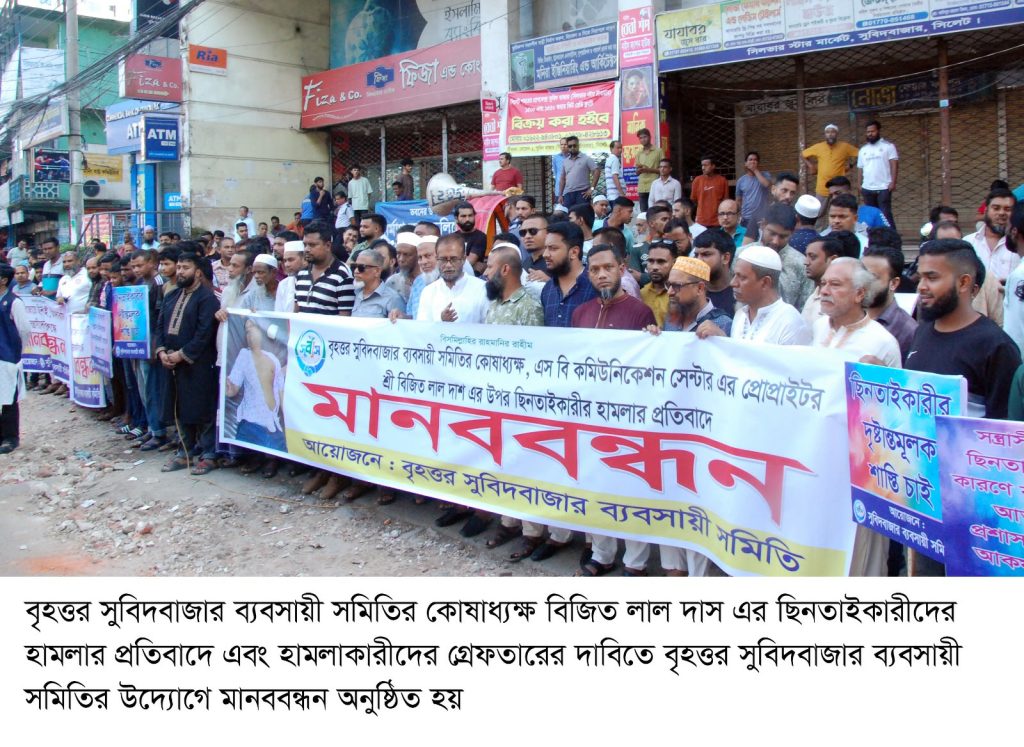 বৃহত্তর সুবিদবাজার ব্যবসায়ী সমিতির কোষাধ্যক্ষ, সিলেট জেলা ব্যবসায়ী ঐক্য কল্যাণ পরিষদের স্বাস্থ্য বিষয়ক সম্পাদক ও এসবি কমিউনিকেশন সেন্টার এর প্রোপাইটর বিজিত লাল দাশ এর ওপর ছিনতাইকারীদের হামলার প্রতিবাদে ও ছিনতাইকারীদের গ্রেফতারের দাবিতে বৃহত্তর সুবিদবাজার ব্যবসায়ী সমিতির উদ্যোগে মানববন্ধন অনুষ্ঠিত হয়েছে। শনিবার (১৮ অক্টোবর) বেলা ২টায় নগরীর সুবিদবাজার পয়েন্টে অনুষ্ঠিত এ মানববন্ধনে সভাপতিত্ব করেন বৃহত্তর সুবিদবাজার ব্যবসায়ী সমিতির সভাপতি সৈয়দ জুবায়ের আহমদ।