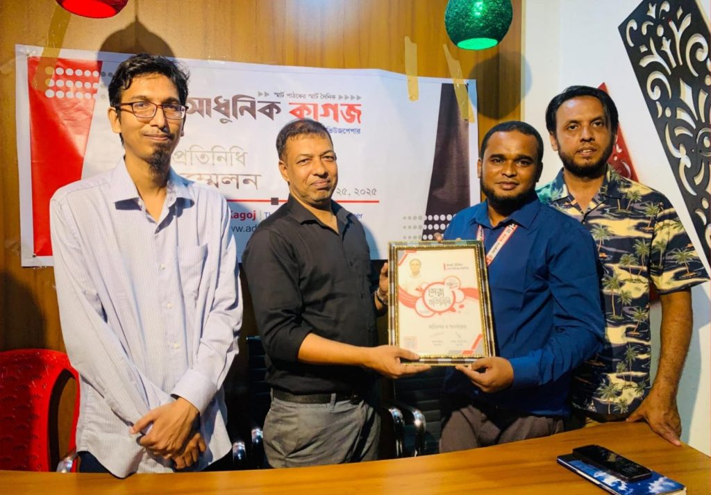 শনিবার (২৫ অক্টোবর) দৈনিক আধুনিক কাগজ এর সেরা প্রতিনিধি ২০২৪-এ হিসেবে সম্মাননা ক্রেস্ট তার হাতে তুলে দেন দৈনিক আধুনিক কাগজের সম্পাদক মঈন উদ্দিন, প্রকাশক সাঈদ চৌধুরী টিপু, মফস্বল সম্পাদক মেহেদি হাসান, স্টাফ রিপোর্টার আহমেদ সবুজ, তুহিনসহ সিলেট বিভাগের বিভিন্ন উপজেলা প্রতিনিধিগণ উপস্থিত ছিলেন।