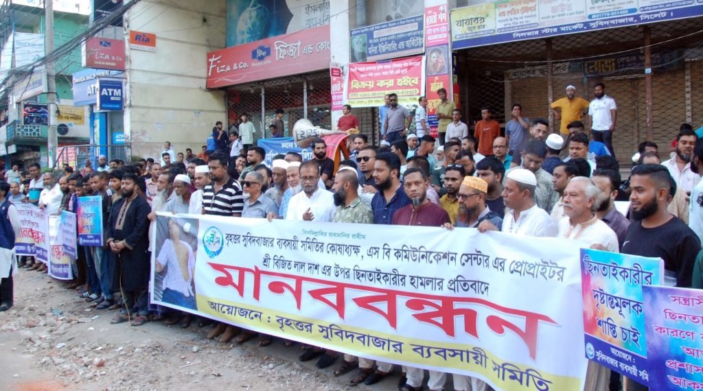বৃহত্তর সুবিধাজার ব্যবসায়ী সমিতির কোষাধ্যক্ষ, সিলেট জেলা ব্যবসায়ী ঐক্য কল্যাণ পরিষদের স্বাস্থ্য বিষয়ক সম্পাদক ও এসবি কমিউনিকেশন সেন্টার এর প্রোপাইটর বিজিত লাল দাশ এর উওর ছিনতাইকারীদের হামলার প্রতিবাদে ও ছিনতাইকারীদের গ্রেফতারের দাবিতে বৃহত্তর সুবিধাজার ব্যবসায়ী সমিতির উদ্যোগে মানববন্ধন অনুষ্ঠিত হয়েছে।