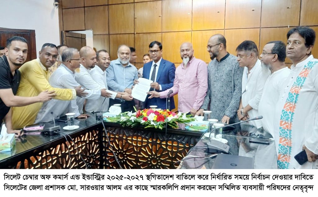 সিলেট চেম্বার অফ কমার্স এন্ড ইন্ডাস্ট্রির ২০২৫-২০২৭ স্থগিতাদেশ বাতিলে করে নির্ধারিত সময়ে নির্বাচন দেওয়ার দাবিতে সিলেটের জেলা প্রশাসক মো. সারওয়ার আলম এর কাছে স্মারকলিপি প্রদান করেছেন সম্মিলিত ব্যবসায়ী পরিষদের নেতৃবৃন্দ।