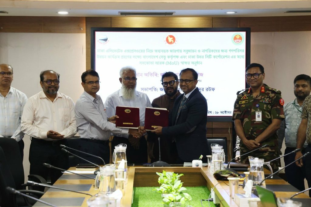 বাংলাদেশ সেতু কর্তৃপক্ষের সম্মেলন কক্ষে ঢাকা এলিভেটেড এক্সপ্রেসওয়ের নিচে অব্যবহৃত জায়গাগুলোর কার্যকর ও নান্দনিক ব্যবহার নিশ্চিত করার লক্ষ্যে সবুজায়ন ও ঢাকা মহানগরীর নাগরিকদের জন্য গণপরিসর উন্নয়ন কার্যক্রম বাস্তবায়ন করার জন্য বাংলাদেশ সেতু কর্তৃপক্ষ এবং ঢাকা উত্তর সিটি কর্পোরেশনের মধ্যে একটি দ্বিপাক্ষিক সমঝোতা স্মারক আজ স্বাক্ষরিত হয়েছে।