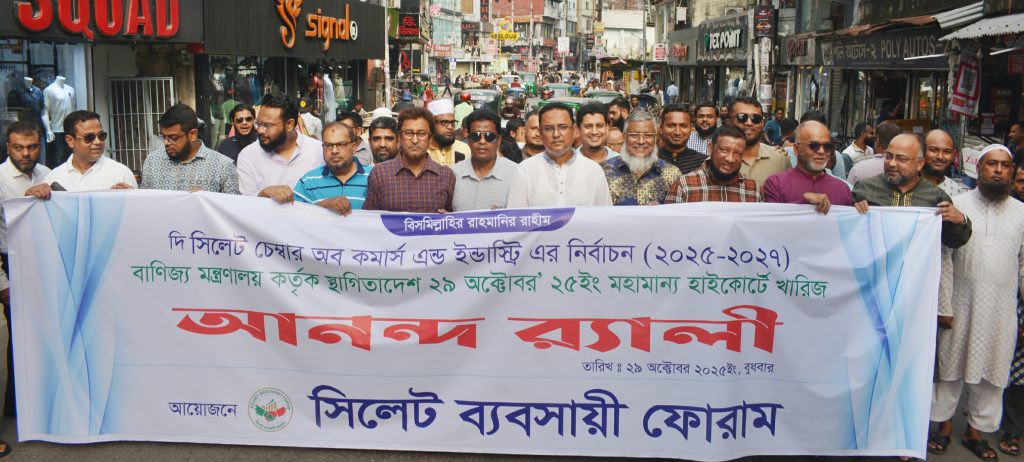সিলেট চেম্বার অব কমার্স এন্ড ইন্ডাস্ট্রির নির্বাচন (২০২৫-২০২৭) বাণিজ্য মন্ত্রণালয়ের স্থগিতাদেশ হাইকোর্ট কর্তৃক খারিজ করায় নগরীতে আনন্দ র্যালি বের করেছে সিলেট ব্যবসায়ী ফোরাম।