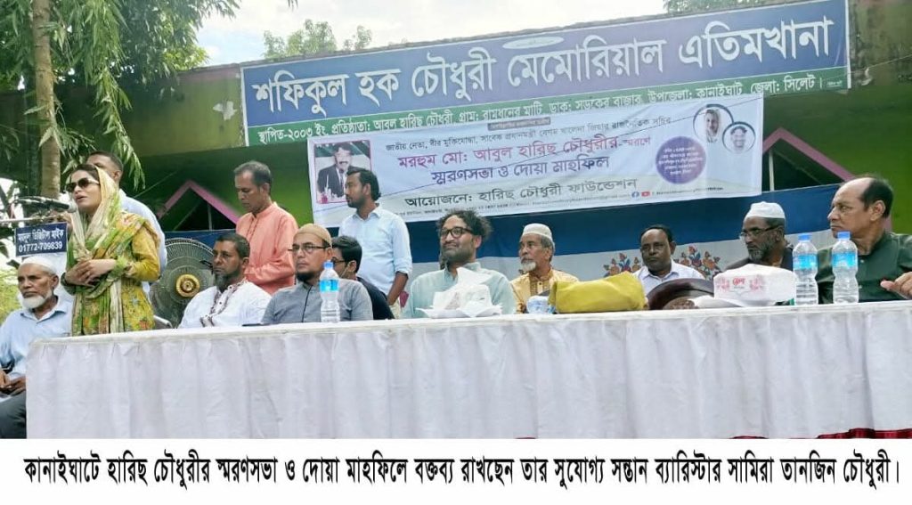 কানাইঘাট:  জাতীয় নেতা সাবেক প্রধানমন্ত্রী বেগম খালেদা জিয়ার রাজনৈতিক সচিব কানাইঘাটের রতœাগর্ভা সন্তান বীরমুক্তিযোদ্ধা মরহুম আবুল হারিছ চৌধুরীর ৭৩ তম জন্মবার্ষিকী উপলক্ষে তার হাতে গড়া কানাইঘাট শফিকুল হক চৌধুরী মেমোরিয়াল এতিমখানা প্রাঙ্গনে স্মরণসভা ও দোয়া মাহফিল অনুষ্ঠিত হয়েছে। হারিছ চৌধুরী ফাউন্ডেশনের আয়োজনে স্মরণসভায় প্রধান অতিথি’র বক্তব্য রাখেন, হারিছ চৌধুরী সুযোগ্য সন্তান ফাউন্ডেশনের প্রতিষ্ঠাতা চেয়ারম্যান ব্যারিষ্টার সামিরা তানজিন চৌধুরী।