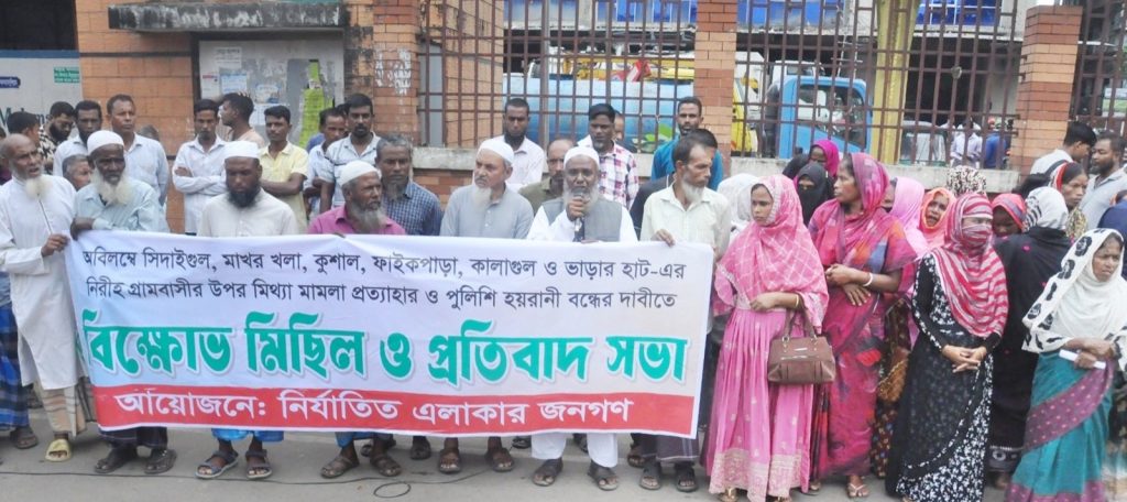 বিমানবন্দর থানার অন্তর্গত ৭ এলাকার নিরীহ মানুষের উপরে মাদককারবারী ও ডাকাত সরদারের দায়েরকৃত মিথ্যা মামলা প্রত্যাহার ও মাদক ব্যবসায়ী, ডাকাত সর্দার, চোরাকারবারি ইলিয়াস, কাউসার, কয়েছ,লায়েক আলামিন গংদের অবিলম্বে গ্রেফতার করে দৃষ্টান্তমূলক শাস্তির দাবিতে মাখরখলা, সিদাইরগুল, কুশাল, বারারহাট, পাইকপাড়া, কালাগুল ও দাধারানি এলাকাবাসীর উদ্যোগে সিলেট সিটি পয়েন্টে প্রতিবাদ সমাবেশ অনুষ্ঠিত হয়েছে।