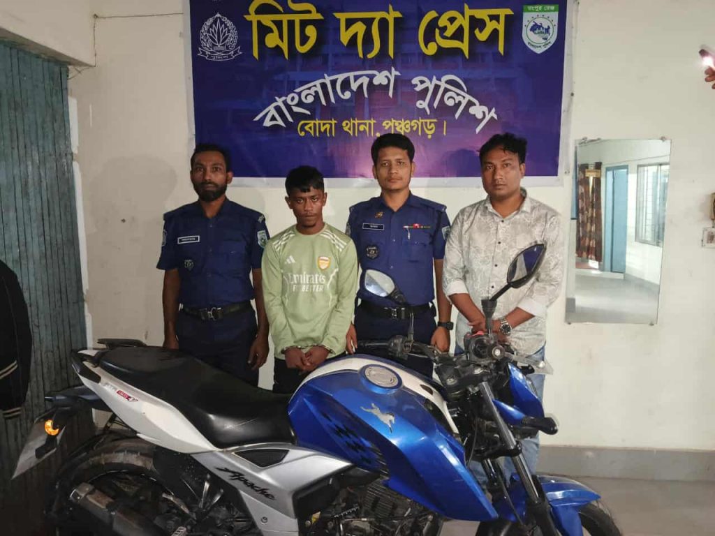 সাইয়্যেদ শান্ত-পঞ্চগড় প্রতিনিধি:পঞ্চগড় জেলার বোদা থানা পুলিশ বিশেষ অভিযান পরিচালনা করে, চুরি হওয়া মোটর সাইকেল উদ্ধারসহ আন্ত: জেলা মোটর সাইকেল চোর চক্রের মূল হোতাকে গ্রেপ্তার করেছেন। আটককৃত রিয়াদ হাসান ওরফে মাসুদ (২৪), পিতা আশরাফুল ইসলাম গ্রাম মুন্সিপাড়া সদর থানা ঠাকুরগাও।
