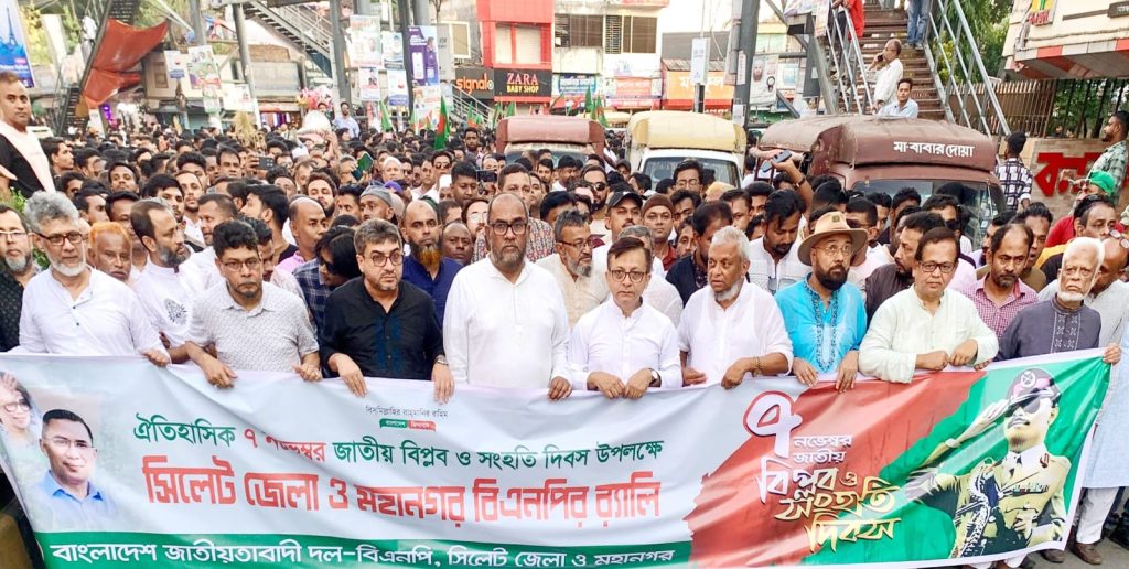 ঐতিহাসিক ৭ নভেম্বর জাতীয় বিপ্লব ও সংহতি দিবস উপলক্ষে সিলেট জেলা ও মহানগর বিএনপির উদ্যোগে এক বিশাল র‌্যালি অনুষ্ঠিত হয়েছে। শুক্রবার (৭ নভেম্বর) বিকেল সাড়ে ৪টায় নগরীর কোর্ট পয়েন্ট থেকে শুরু হয়ে র‌্যালিটি শহীদ মিনারে গিয়ে শেষ হয়। র‌্যালিপূর্ব এক সমাবেশে প্রধান অতিথির বক্তব্যে বিএনপি চেয়ারপারসনের উপদেষ্টা খন্দকার আব্দুল মুক্তাদির বলেন, সিলেট-১ (সিটি ও সদর) আসনে বিএনপি মনোনীত প্রার্থী বিএনপি চেয়ারপার্সনের উপদেষ্টা খন্দকার আব্দুল মুক্তাদির বলেছেন, শহীদ প্রেসিডেন্ট জিয়াউর রহমান ও ৭ নভেম্বর বাংলাদেশের ইতিহাসের অবিচ্ছেদ্য অংশ। এই দিনে সিপাহী-জনতার অভূত্থানের মাধ্যমে জিয়াউর রহমান ক্ষমতা গ্রহণ করেন এবং দেশ গভীর রাজনৈতিক সংকট থেকে মুক্তি করে বাংলাদেশে বহুদলীয় গণতন্ত্র পুনঃপ্রতিষ্ঠার করেন তিনি। তাঁর শাসনামলে গ্রামীণ উন্নয়ন, কৃষি, ও অন্যান্য খাতে গুরুত্বপূর্ণ পরিবর্তন আধুনিক বাংলাদেশ গড়ার পথে পরিকল্পনা করে কাজ শুরু হয়। শহীদ জিয়ার নেতৃত্বে এই দেশ সর্বক্ষেত্রে স্বংয়ন সম্পন্নতা অর্জন করে।