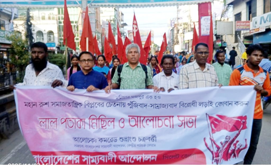 মহান রুশ বিপ্লবের ১০৮ তম বার্ষিকী উপলক্ষে বাংলাদেশের সাম্যবাদী আন্দোলন সিলেট জেলার উদ্যোগে শুক্রবার (৭ নভেম্বর) বিকাল ৪ টায় সিলেট কেন্দ্রীয় মুসলিম সংসদের সাহিত্য আসর কক্ষে আলোচনা সভা অনুষ্ঠিত হয়। আলোচনা সভার পূর্বে লাল পতাকা মিছিল শহরের গুরুত্বপূর্ণ সড়ক প্রদক্ষিণ করে আলোচনা সভা স্থলে এসে শেষ হয়।