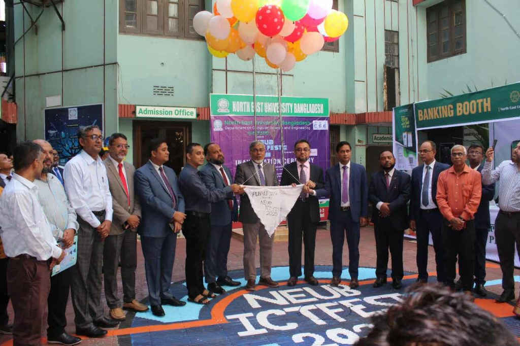বর্ণাঢ্য আয়োজন ও উৎসবমুখর পরিবেশে নর্থ ইস্ট ইউনিভার্সিটি বাংলাদেশ (এনইইউবি) এ তিন দিনব্যাপী ‘এনইইউবি আইসিটি ফেস্ট ২০২৫’ এর আনুষ্ঠানিক উদ্বোধন করা হয়েছে। শনিবার (৮ নভেম্বর ২০২৫) সকাল ১০ টায় ইউনিভার্সিটির শেখঘাট ক্যাম্পাসে উৎসবের উদ্বোধন করেন নর্থ ইস্ট ইউনিভার্সিটির উপাচার্য প্রফেসর ড. ইঞ্জিনিয়ার মোহাম্মদ ইকবাল ও পূবালী ব্যাংক পিএলসির উপ ব্যবস্থাপনা পরিচালক (ডিএমডি) আহমদ এনায়েত মঞ্জুর। এতে সভাপতিত্ব করেন নর্থ ইস্ট ইউনিভার্সিটির স্যোশাল সায়েন্স অ্যান্ড ইঞ্জিনিয়ারিং অনুষদের ডিন ও সিএসই বিভাগের প্রধান এবং আইসিটি ফেস্টের সমন্বয়ক ড. আরিফ আহমদ।