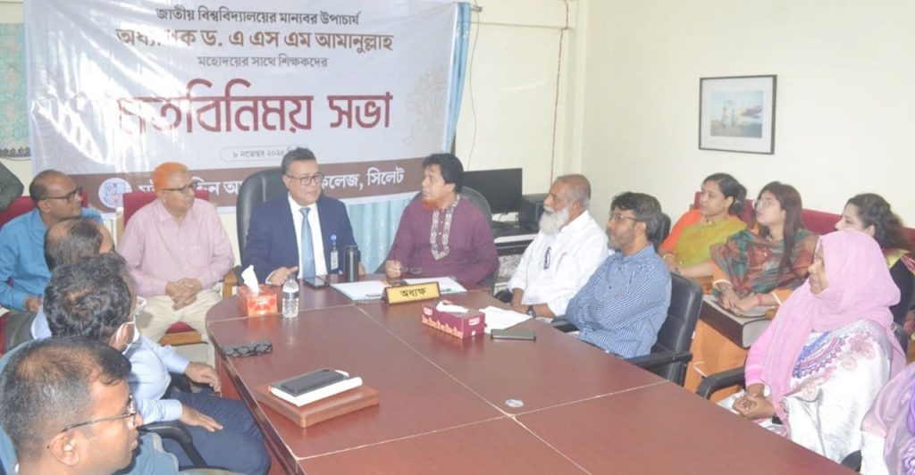 জাতীয় বিশ্ববিদ্যালয়ের উপাচার্য অধ্যাপক ড. এ এস এম আমানুল্লাহ এর সাথে মইনউদ্দিন আদর্শ মহিলা কলেজ শিক্ষকদের এক মতবিনিময় সভা অনুষ্ঠিত হয়েছে। শনিবার (৮ নভেম্বর) সকালে কলেজ পরিদর্শন শেষে সিলেট নগরীর শামীমাবাদস্থ কলেজের হলরুমে এই মতবিনিময় সভার আয়োজন করা হয়।
