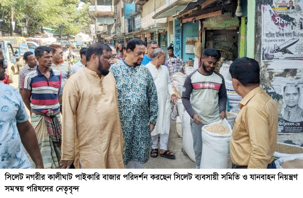 মঙ্গলবার (১১ নভেম্বর) সকালে সিলেট নগরীর ভিতরে সিলেট ব্যবসায়ী সমিতির আওতাধীন ৭টি বাজার পরিদর্শন করেন সিলেট ব্যবসায়ী সমিতির নেতৃবৃন্দ। এসময় তারা বলেন, সিলেটের প্রাচীন ও সুপরিচিত পাইকারি বাজার গুলোর মধ্যে একটি কালীঘাটের বাজার একটি বিভাগীয় বাজার। শুধু বাজার নয় এটি একটি প্রাচীনতম সুরমা নদীর বন্দর, যা দিয়ে নৌপথে বতমানে বর্ষাকালে মালামাল আমদানি রফতানি হয়ে থাকে, একসময় সারাটা বছর নৌপথে মালামাল আসা যাওয়া হত, নদীর নাব্যতা হারিয়ে যাওয়াতে এখন শুধু বর্ষার সময় নৌপথে চালু থাকে, দীর্ঘদিন ধরে এখানকার প্রবীণ ও নবীনে ব্যবসায়ীরা ব্যবসা পরিচালনা করে আসছেন। শুধু সিলেট নয় আশপাশে জেলার ব্যবসায়ীরাও এখান থেকে পাইকারি ও খুচরা ক্রেতারা পণ্য সংগ্রহ করে থাকেন। নেতৃবৃন্দ আরও বলেন, হঠাৎ করে বাজার সরিয়ে নেওয়ার ঘোষণা ব্যবসায়ী সমাজে চরম অস্থিরতা ও হতাশা তৈরি হয়েছে। বৃহওর এই এালাকার ব্যবসায়ীদের সাথে আলোচনা বা মতামত না নিয়েই বাজার স্থানান্তরের পরিকল্পনা গ্রহণ করা হলে তা হবে অবিবেচনা প্রসূত সিদ্ধান্ত। এতে শত শত ব্যবসায়ী পরিবার ক্ষতিগ্রস্ত হবে এবং বাজারের ঐতিয্য ও অর্থনৈতিক স্থিতিশীলতা নষ্ট হবে।