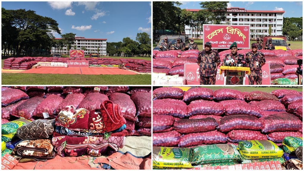 বিজিবি জানায় গত ১২ ও ১৩ নভেম্বর রাতে গোপন সংবাদের ভিত্তিতে ব্যাটালিয়নের দায়িত্বাধীন সীমান্তবর্তী এলাকা কালাইরাগ, দমদমিয়া, সোনালীচেলা, বাংলাবাজার ও তামাবিল বিওপি কর্তৃক অভিযান পরিচালনা করা হয়। অভিযানে ভারতীয় জিরা, মাইফেয়ার ক্রিম, পন্ডস ও হোয়াইটটোন ফেসওয়াস, কাবেরী মেহেদী, কিটক্যাট চকলেট, চিনি, গরু, সুপারি, কম্বল এবং বাংলাদেশ থেকে পাচারকালে শিং মাছসহ বালু উত্তোলনকারী নৌকা আটক করা হয়।