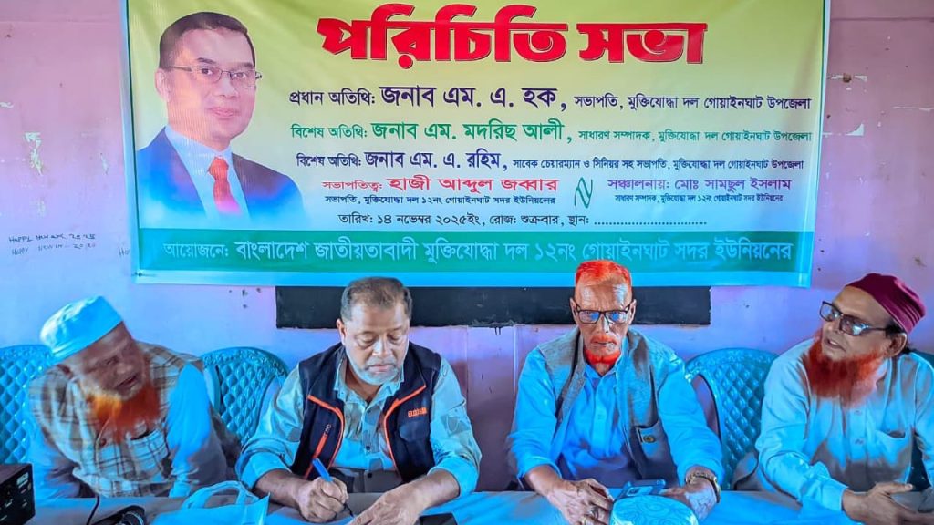 সিলেটের গোয়াইনঘাটে ১২নং গোয়াইনঘাট সদর ইউনিয়ন মুক্তিযোদ্ধা দলের পরিচিতি সভা অনুষ্ঠিত হয়েছে। শুক্রবার (১৪ নভেম্বর) বিকাল ৪টায় পরগনা বাজার উচ্চ বিদ্যালয় এন্ড কলেজে ১২নং গোয়াইনঘাট সদর ইউনিয়ন মুক্তিযোদ্ধাদলের আয়োজনে গোয়াইনঘাট সদর ইউনিয়ন মুক্তিযোদ্ধা দলের সাধারণ সম্পাদক মোঃ সামছুল ইসলামের পরিচালনায় মুক্তিযোদ্ধা দল ১২নং গোয়াইনঘাট সদর ইউনিয়নের সভাপতি হাজী আব্দুল জব্বারের সভাপতিত্বে প্রধান অতিথি হিসাবে উপস্থিত ছিলেন মুক্তিযোদ্ধা দল গোয়াইনঘাট উপজেলা শাখার সভাপতি এম এ হক। পরিচিতি সভায় বিশেষ অতিথি হিসাবে উপস্থিত ছিলেন মুক্তিযোদ্ধা দল গোয়াইনঘাট উপজেলা শাখার সাধারণ সম্পাদক এম. মদরিছ আলী, সাবেক অবিভক্ত ২নং পশ্চিম জাফলং ইউনিয়নের চেয়ারম্যান ও মুক্তিযোদ্ধা দল গোয়াইনঘাট উপজেলা শাখার সিনিয়র সহ সভাপতি এম এ রহিম। এসময় জাতীয়তাবাদীদল বিএনপি ও অঙ্গ সহযোগী সংগঠনের নেতাকর্মী সহ মুক্তিযুদ্ধাদলের শতাধিক নেতাকর্মী