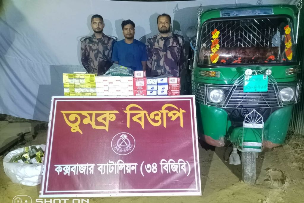 কক্সবাজার ব্যাটালিয়নের (৩৪ বিজিবি) অধিনায়ক লেফটেন্যান্ট কর্নেল এস এম খায়রুল আলম (পিএসসি) এ বিষয়ে সত্যতা নিশ্চিত করে বলেন, গোপন তথ্যের ভিত্তিতে সন্ধ্যা ৬টা ৪৫ মিনিটে সীমান্ত পিলার ৩৩ থেকে প্রায় দুই হাজার গজ ভেতরে টিভি টাওয়ার এলাকায় বিশেষ চোরাচালানবিরোধী অভিযান চালানো হয়। এ সময় একটি সিএনজিতে করে বিভিন্ন ধরনের বাংলাদেশি ঔষধ ও সাইকেল পার্টস পাচারকালে মোহছেন আলী (২৬) নামের এক যুবককে আটক করা হয়। তার বাড়ি টেকনাফের হোয়াইক্যং ইউনিয়নের কাটাখালি গ্রামে।