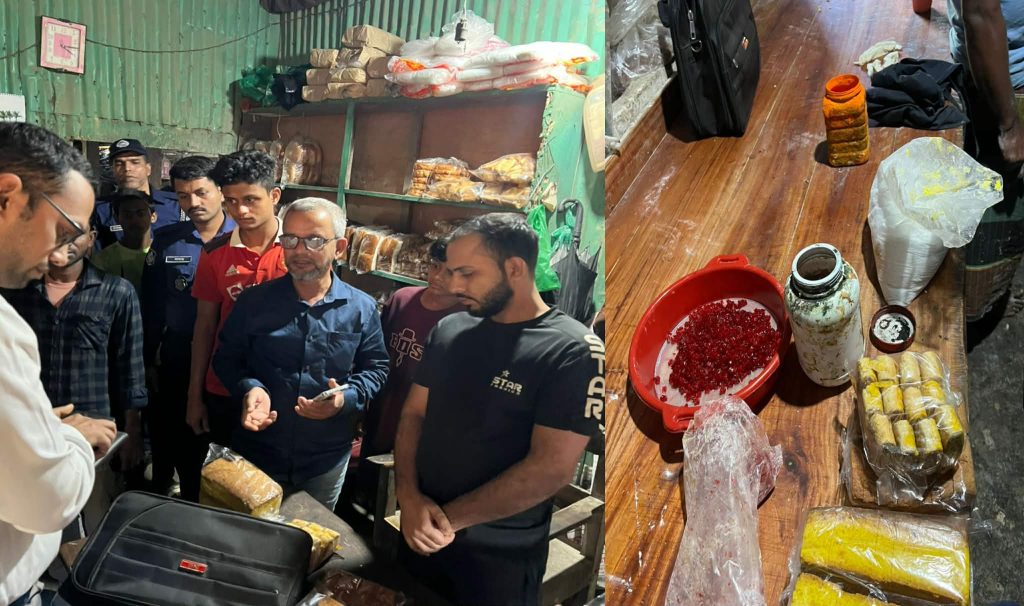 মঙ্গলবার (১৮ নভেম্বর) নবীগঞ্জ উপজেলার কালিয়ারভাঙ্গা ইউনিয়নের ইমামবাড়ি বাজারে উপজেলা প্রশাসনের উদ্যোগে পরিচালিত মোবাইল কোর্টের অভিযানে এসব অনিয়ম ধরা পড়ে। উপজেলা সহকারী কমিশনার (ভূমি) ও নির্বাহী ম্যাজিস্ট্রেট প্রত্যয় হাশেমের নেতৃত্বে পরিচালিত এই অভিযানে দেখা যায়—বেকারির পণ্যসমূহে কোনো লেবেল বা উৎপাদনের তারিখ নেই, ব্যবহৃত ডালডা, তেল ও ক্রিম মেয়াদোত্তীর্ণ, আর ফুড কালারের পরিবর্তে কাপড়ের রং ব্যবহার করা হচ্ছে। এছাড়া ক্ষতিকর অ্যামোনিয়াম মেশানো খাদ্য উৎপাদনের প্রমাণ মেলে।