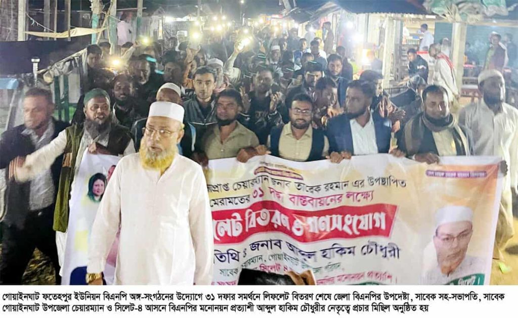 সিলেট জেলা বিএনপির উপদেষ্টা, সাবেক সহ-সভাপতি, গোয়াইনঘাট উপজেলা পরিষদের সাবেক চেয়ারম্যান ও সিলেট-৪ আসনে (গোয়াইনঘাট, জৈন্তাপুর ও কোম্পানীগঞ্জ) বিএনপির মনোনয়ন প্রত্যাশী আব্দুল হাকিম চৌধুরী বলেছেন, আগামী ফেব্রুয়ারীতেই জাতীয় নির্বাচন অনুষ্ঠিত হবে। কোন ষড়যন্ত্রই নির্বাচন বানচাল করতে পারবেনা। ঐ নির্বাচনে বিপুল ভোটে বিজয়ী হয়ে বিএনপি সরকার গঠন করবে। স্থানীয় জনগোষ্ঠী ও তৃনমূল নেতাকর্মীর আবেগ অনুভুতিকে প্রাধান্য দিয়ে প্রার্থী মনোনয়ন দিলে সিলেট-৪ আসনে ধানের শীষের বিজয় কেউ ঠেকাতে পারবেনা।
