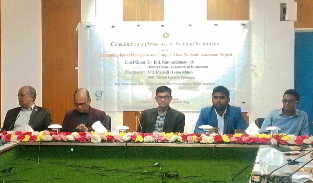টাঙ্গুয়ার হাওরের জীববৈচিত্র্য, পরিবেশ-প্রতিবেশ রক্ষায় ‘জলাভূমি সম্পদের বিবেচনাপ্রসুত ব্যবহার নিশ্চিতকরণে পরামর্শ কর্মশালা’ অনুষ্ঠিত হয়েছে। পরিবেশ অধিদপ্তর কর্তৃক বাস্তবায়নাধীন কমিউনিটি বেইজড ম্যানেজমেন্ট অফ টাঙ্গুয়ার হাওর ওয়েটল্যান্ড ইকোসিস্টেম শীর্ষক প্রকল্প কর্মশালার আয়োজন করে বৃহস্পতিবার সুনামগঞ্জের তাহিরপুর উপজেলা পরিষদ হলরুমে দিনব্যাপী গুরুত্বপূর্ণ কর্মশালা চলে। প্রধান অতিথি ছিলেন পরিবেশ অধিদপ্তরের মহাপরিচালক ড. মোহাম্মদ কামরুজ্জামান।
